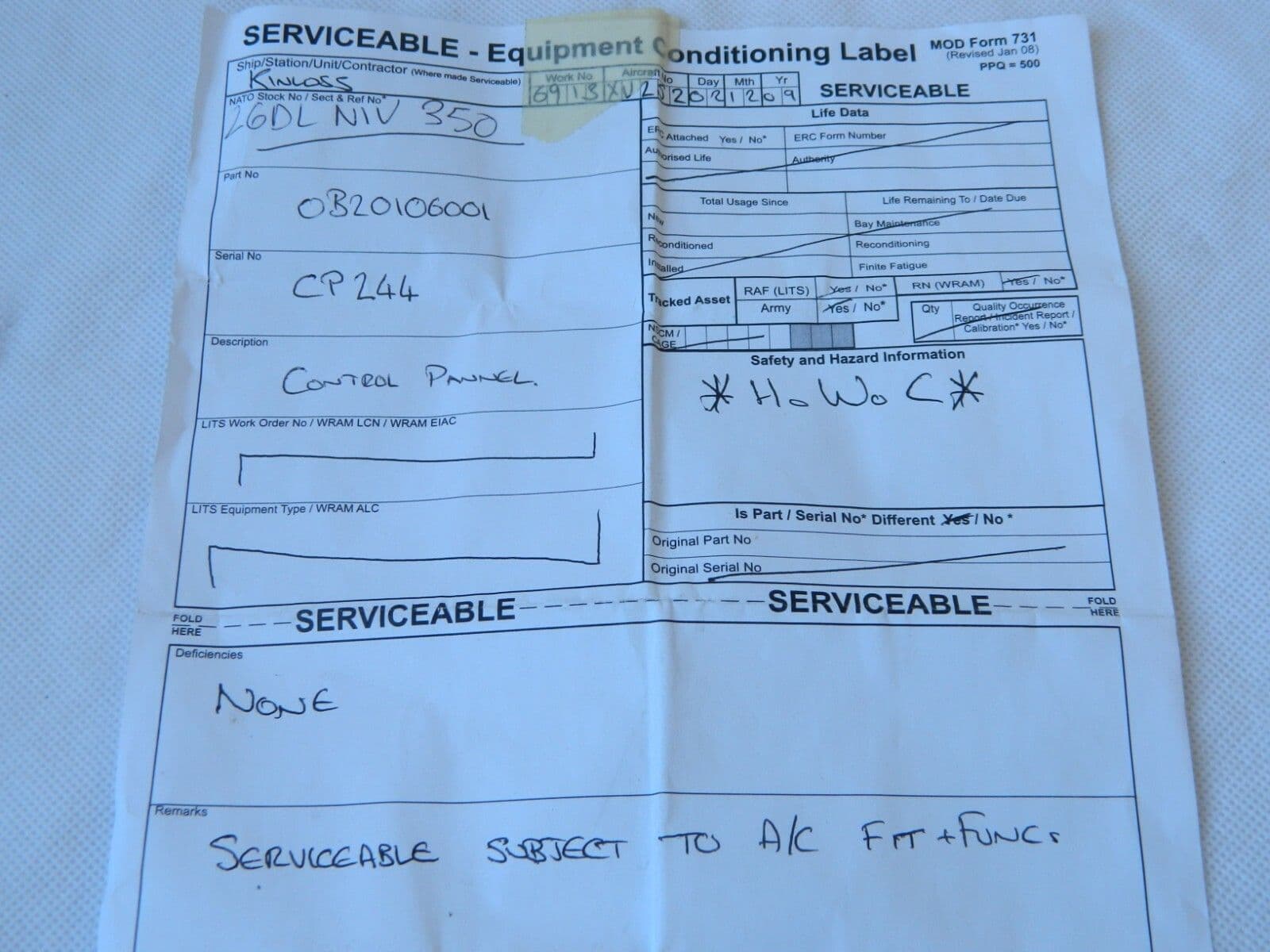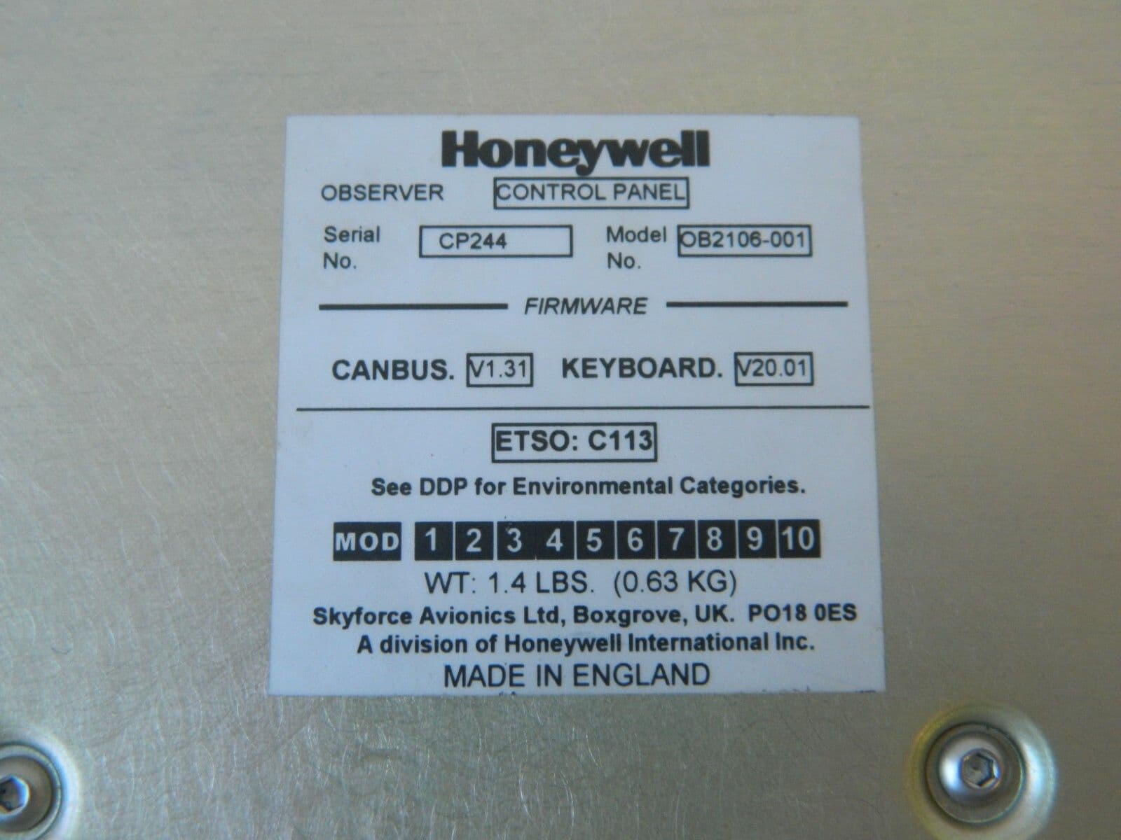Honeywell Observer Aircraft Control Panel Part No: OB2106-001 [1R10B]