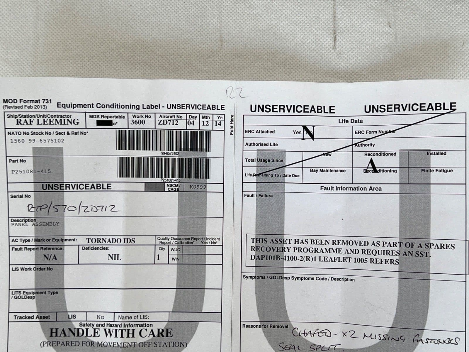Tornado Aircraft L319 Cover Access Panel From ZD712, P-251081-415 [PL18]