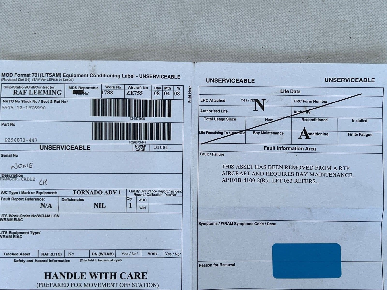 Tornado Aircraft L/H Guide Arm Cable Support Hanger From ZE755 [1R8E]
