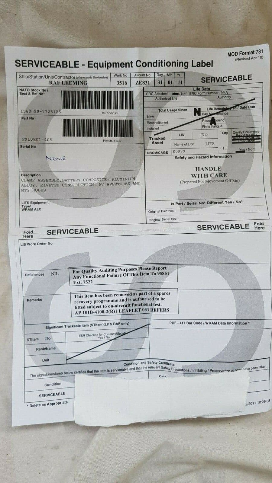 Tornado F3 Battery Clamp from Aircraft ZE831. Part No P-910801-405 [GR3D]